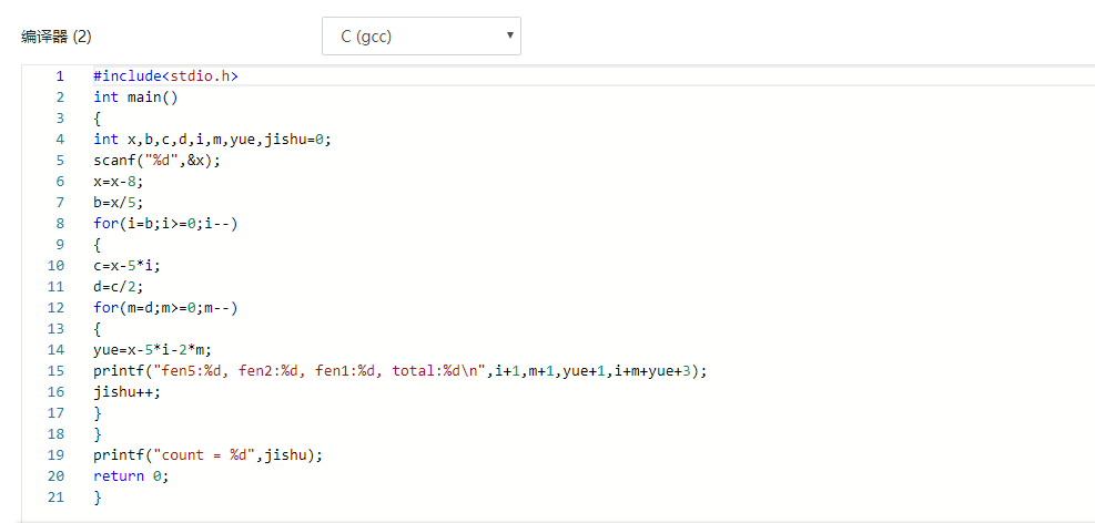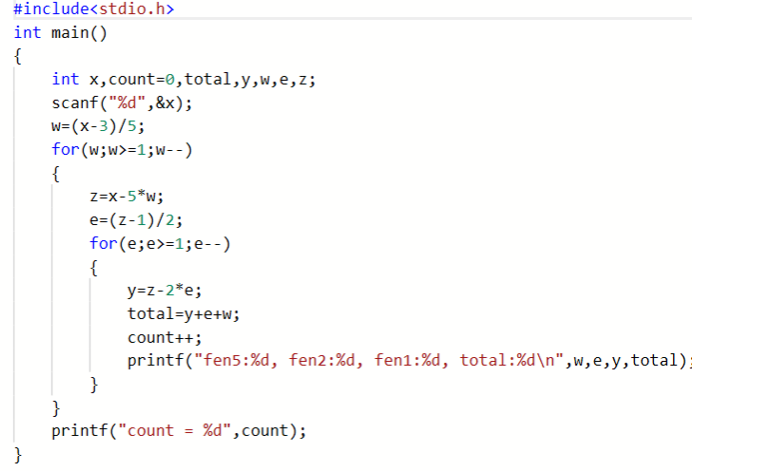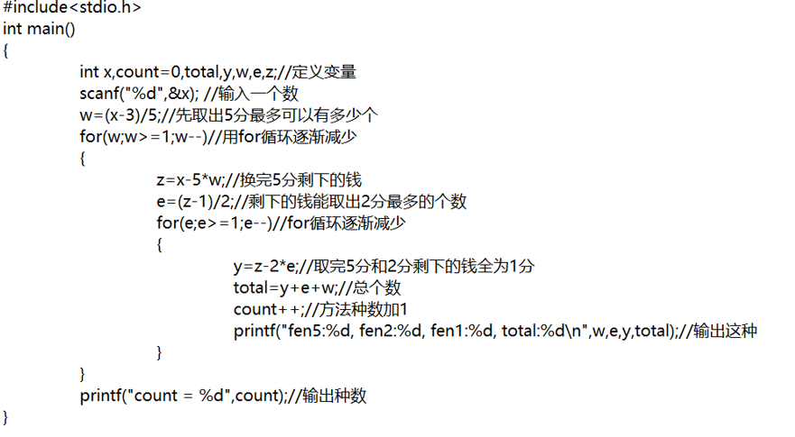 要求按5分、2分和1分硬币的数量依次从大到小的顺序,输出各种换法。每行输出一种换法,格式为:“fen5:5分硬币数量, fen2:2分硬币数量, fen1:1分硬币数量, total:硬币总数量”。最后一行输出“count = 换法个数”。