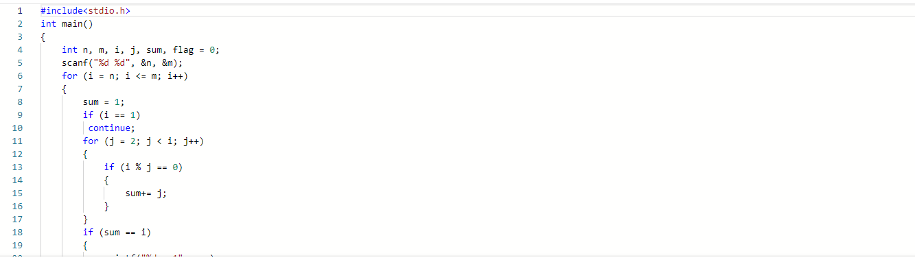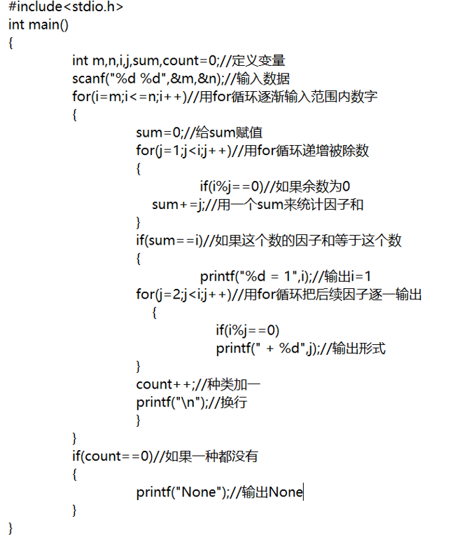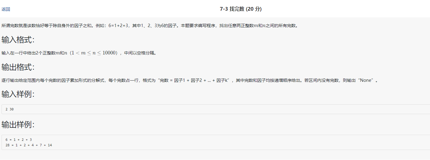 | 2 30 | 6 = 1 + 2 + 3 28 = 1 + 2 + 4 + 7 + 14 | 2到30这个范围完数有6和28 |