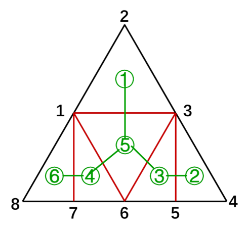 如图,是一个凸 8 边形(我只是省事,没有让各点外凸,不影响看图)。红色边是相邻三角形的邻边,是可走边。