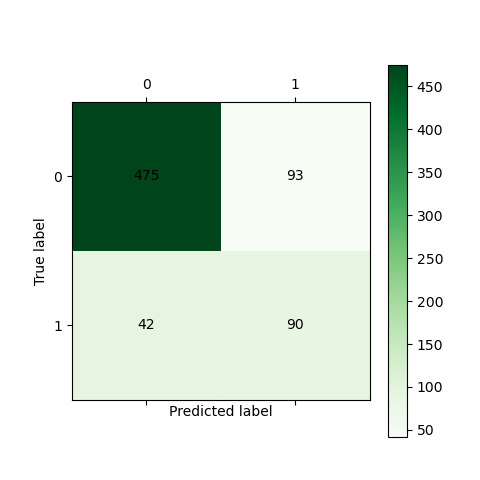plt.matshow(cm, cmap=plt.cm.Greens) #画混淆矩阵图,配色风格使用cm.Greens,更多风格请参考官网。