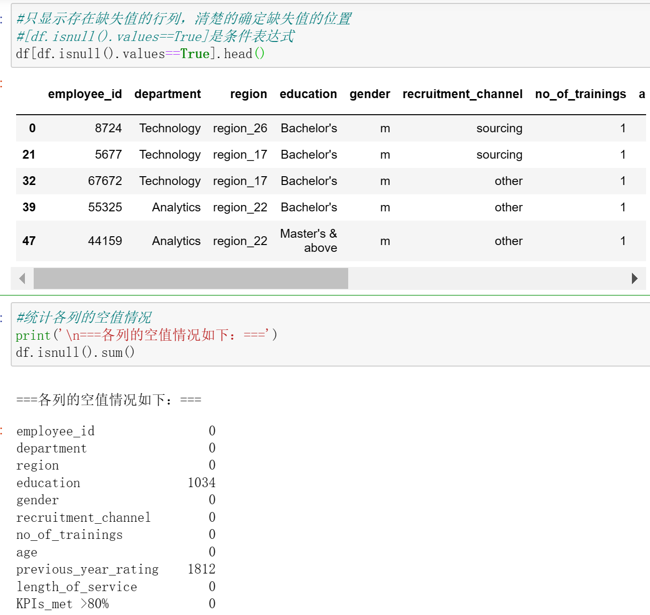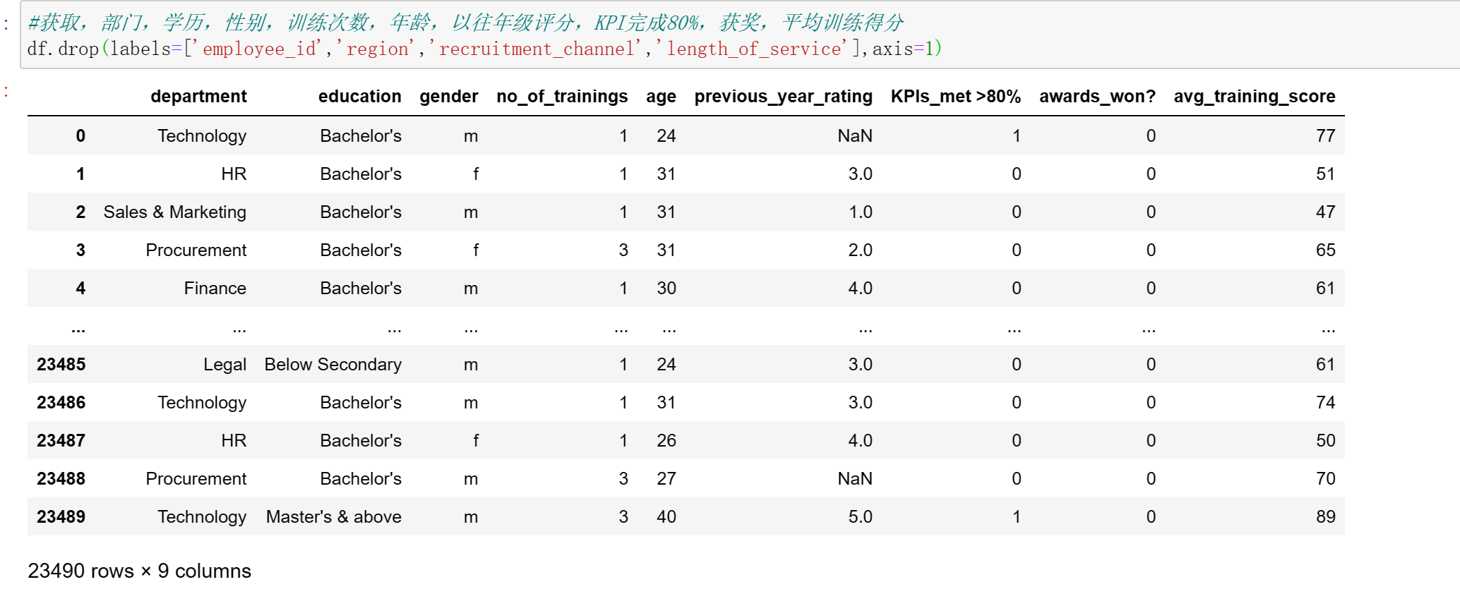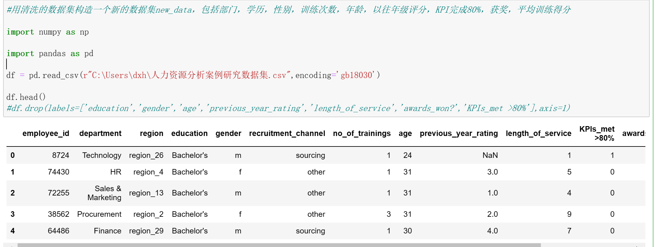 #用清洗的数据集构造一个新的数据集new_data,包括部门,学历,性别,训练次数,年龄,以往年级评分,KPI完成80%,获奖,平均训练得分 import numpy as np import pandas as pd df = pd.read_csv(r"C:\Users\dxh\人力资源分析案例研究数据集.csv",encoding='gb18030') df.head() #df.drop(labels=['education','gender','age','previous_year_rating','length_of_service','awards_won?','KPIs_met >80%'],axis=1)