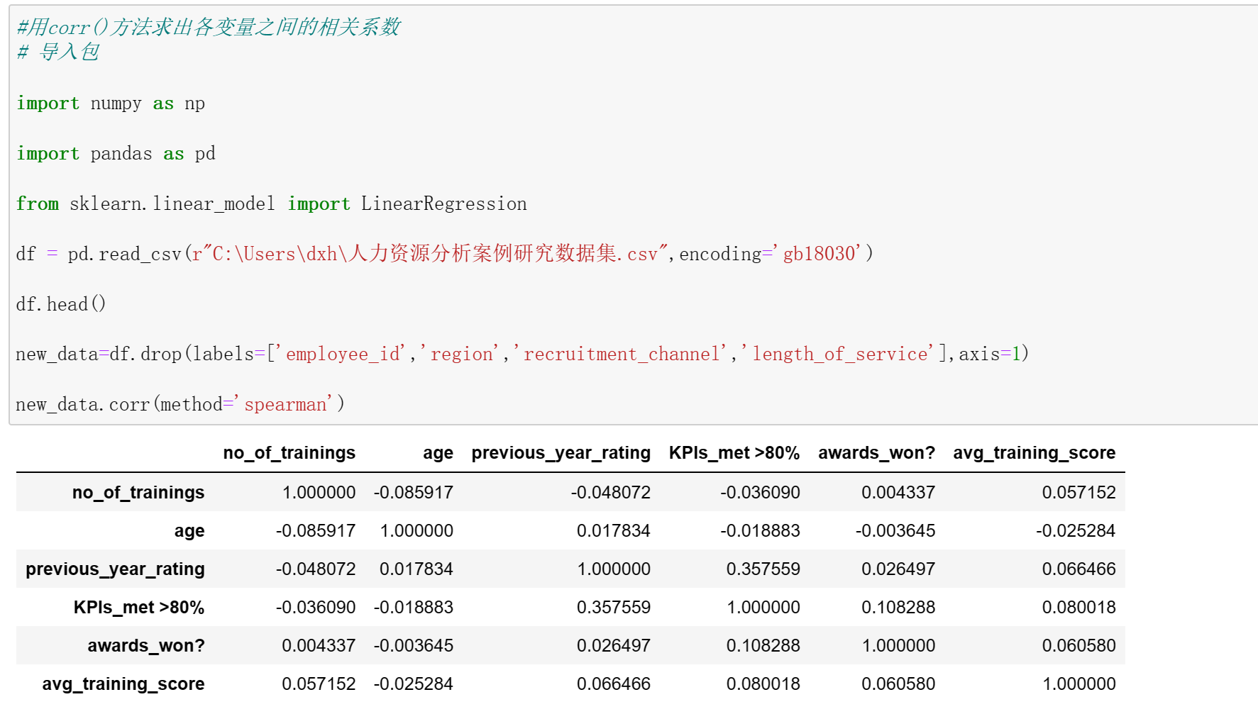 #用corr()方法求出各变量之间的相关系数 # 导入包 import numpy as np import pandas as pd from sklearn.linear_model import LinearRegression df = pd.read_csv(r"C:\Users\dxh\人力资源分析案例研究数据集.csv",encoding='gb18030') df.head() new_data=df.drop(labels=['employee_id','region','recruitment_channel','length_of_service'],axis=1) new_data.corr(method='spearman')