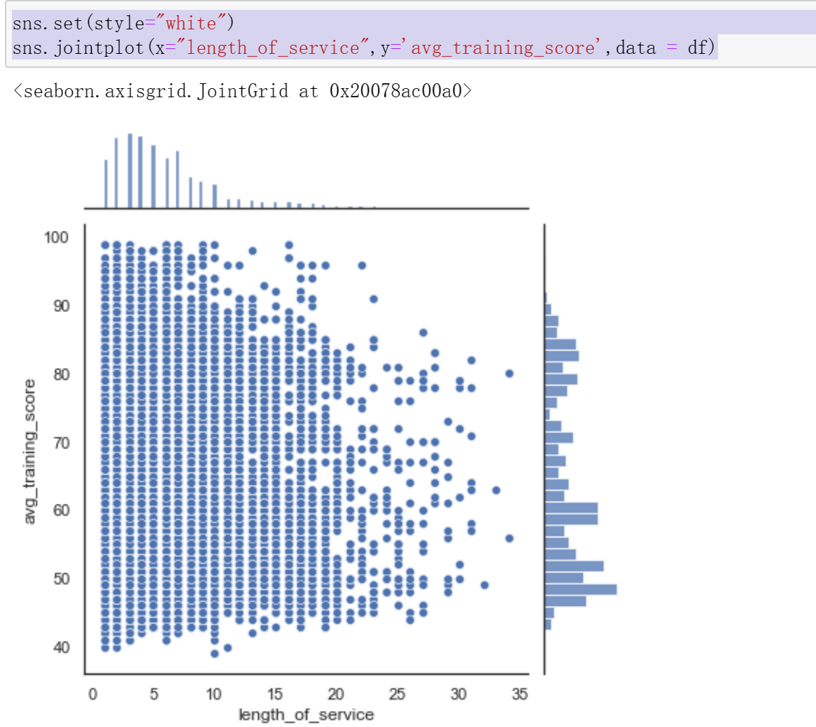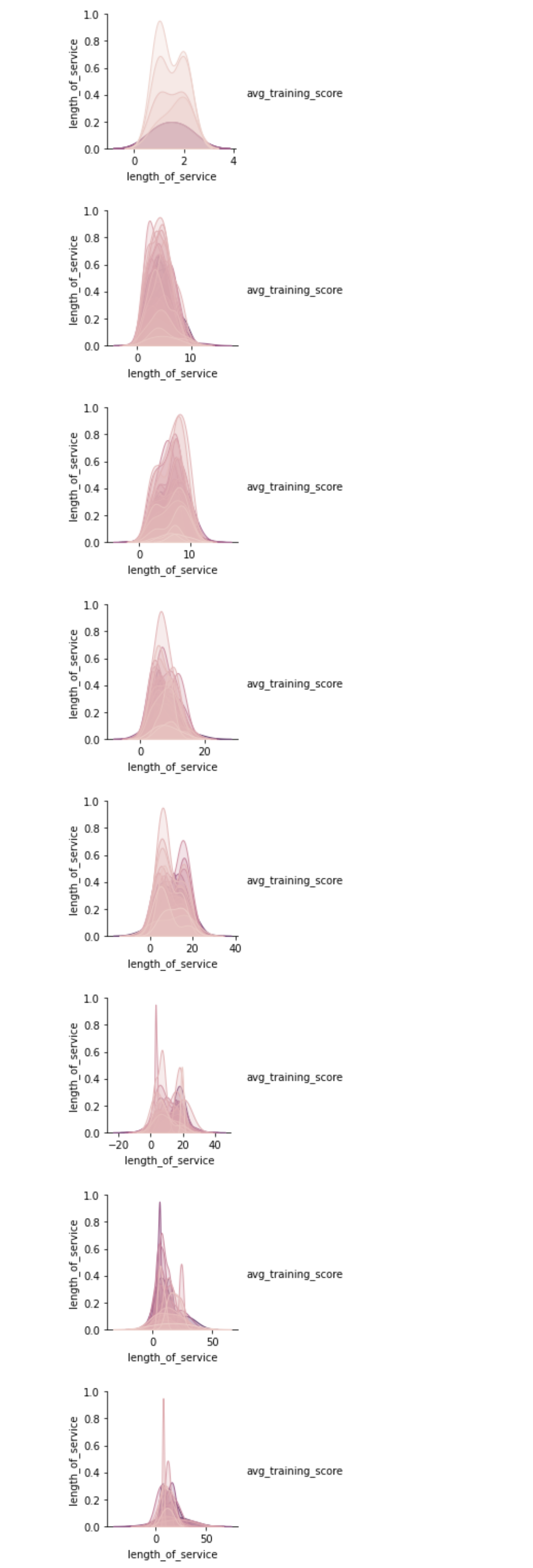 #平均训练得分和工作时长 import seaborn import matplotlib.pyplot as plt seaborn.pairplot(df[df.age == 21], vars = ['length_of_service'], hue = 'avg_training_score') plt.show() seaborn.pairplot(df[df.age == 30], vars = ['length_of_service'], hue = 'avg_training_score') plt.show() seaborn.pairplot(df[df.age== 35], vars = ['length_of_service'], hue = 'avg_training_score') plt.show() seaborn.pairplot(df[df.age== 40], vars = ['length_of_service'], hue = 'avg_training_score') plt.show() seaborn.pairplot(df[df.age== 45], vars = ['length_of_service'], hue = 'avg_training_score') plt.show() seaborn.pairplot(df[df.age==50], vars = ['length_of_service'], hue = 'avg_training_score') plt.show() seaborn.pairplot(df[df.age==55], vars = ['length_of_service'], hue = 'avg_training_score') plt.show() seaborn.pairplot(df[df.age==60], vars = ['length_of_service'], hue = 'avg_training_score') plt.show()