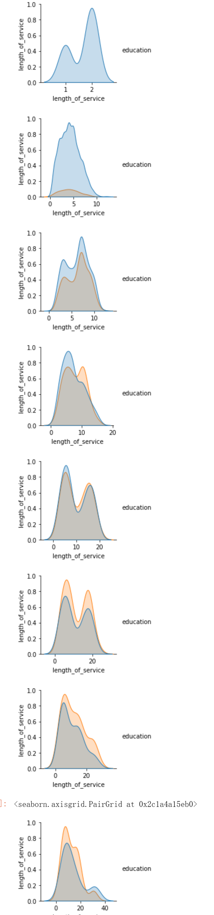 import seaborn import matplotlib.pyplot as plt seaborn.pairplot(df[df.age == 21], vars = ['length_of_service'], hue = 'education') plt.show() seaborn.pairplot(df[df.age == 30], vars = ['length_of_service'], hue = 'education') plt.show() seaborn.pairplot(df[df.age== 35], vars = ['length_of_service'], hue = 'education') plt.show() seaborn.pairplot(df[df.age== 40], vars = ['length_of_service'], hue = 'education') plt.show() seaborn.pairplot(df[df.age== 45], vars = ['length_of_service'], hue = 'education') plt.show() seaborn.pairplot(df[df.age==50], vars = ['length_of_service'], hue = 'education') plt.show() seaborn.pairplot(df[df.age==55], vars = ['length_of_service'], hue = 'education') plt.show() seaborn.pairplot(df[df.age==60], vars = ['length_of_service'], hue = 'education')