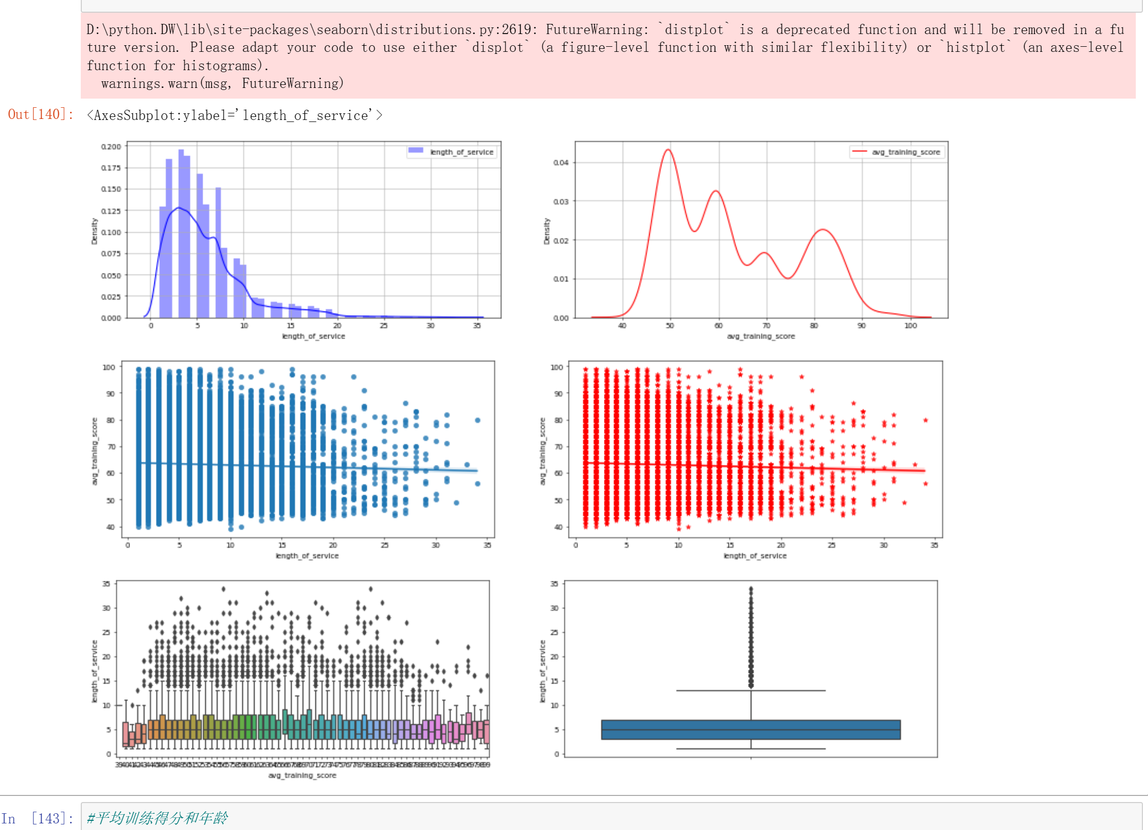 #平均训练得分和工作时长 import seaborn as sns import matplotlib.pyplot as plt plt.figure( figsize=(20,15), dpi=50) plt.subplot(3,2,1) plt.grid(True) sns.distplot(df['length_of_service'],color='b',label='length_of_service') plt.legend(loc='upper right') plt.subplot(3,2,2) sns.kdeplot(df['avg_training_score'],color='r',label='avg_training_score') plt.legend(loc='upper right') plt.grid(True) plt.figure( figsize=(20,15), dpi=50) plt.subplot(3,2,3) sns.regplot(x='length_of_service',y='avg_training_score',data=df) plt.subplot(3,2,4) sns.regplot(x='length_of_service',y='avg_training_score',data=df,color='r',marker='*') plt.figure( figsize=(20,15), dpi=50) plt.subplot(3,2,5) sns.boxplot(x='avg_training_score',y='length_of_service',data=df) plt.subplot(3,2,6) sns.boxplot(y='length_of_service',data=df)