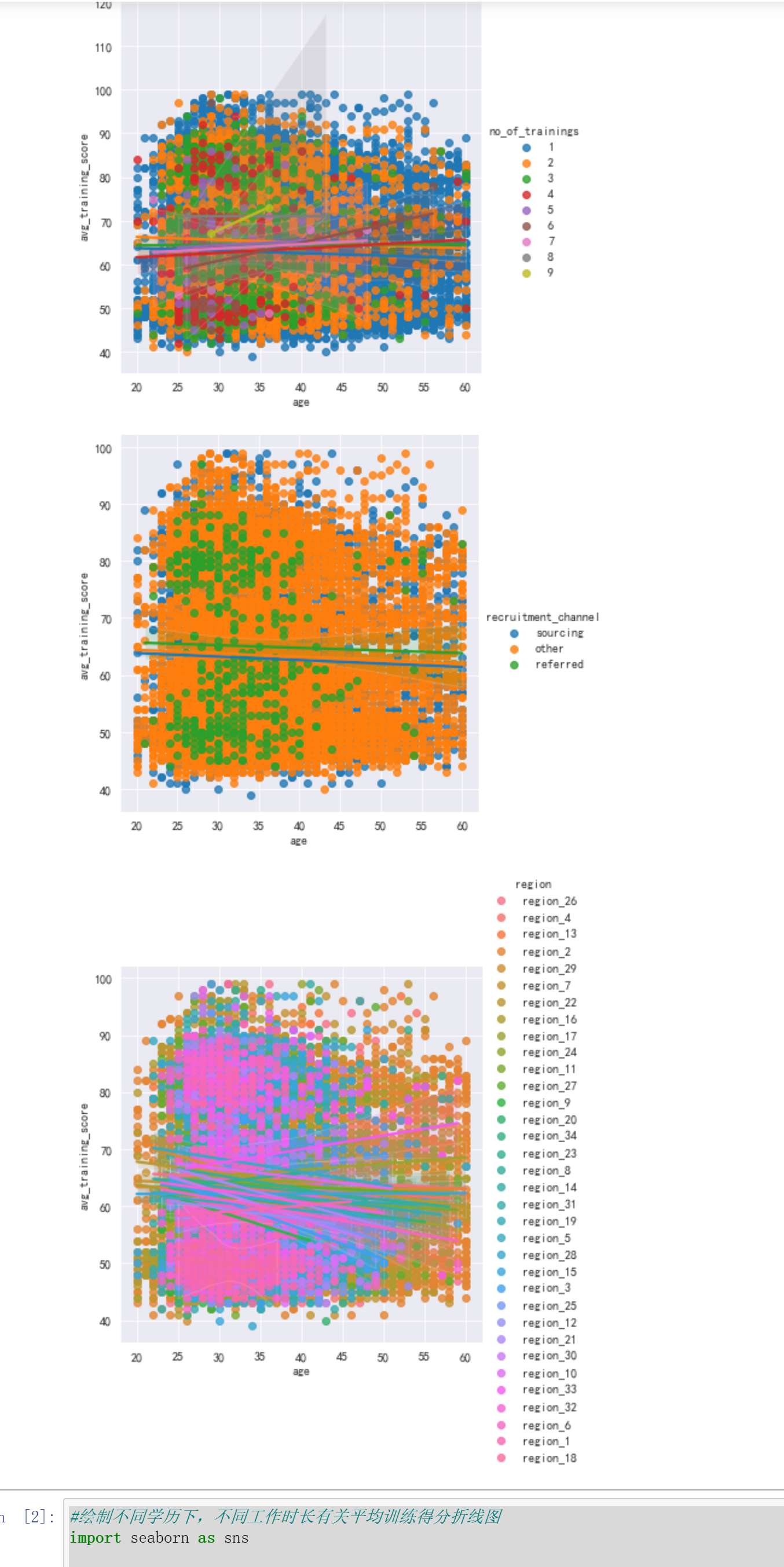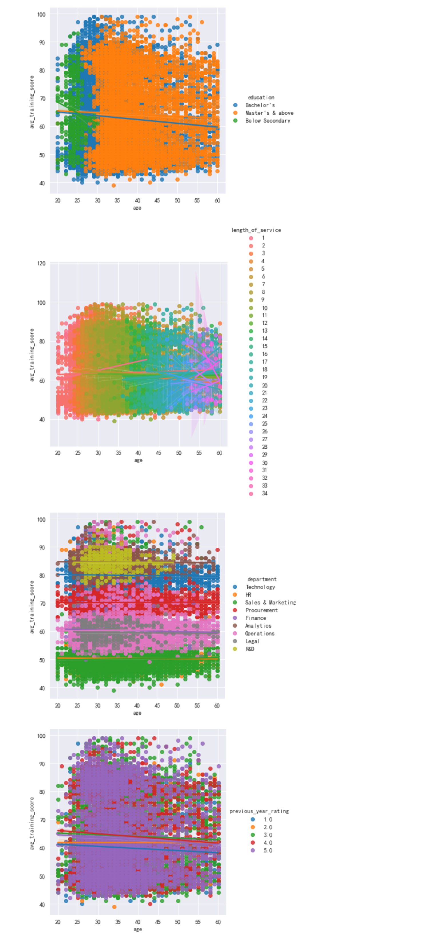 #用lmplot()命令探索多个变量带来的交互作用 import pandas as pd import seaborn as sns #引入hue参数(hue=education)进行分类,并分析不同学历水平和训练平均得分的有什么不同 sns.lmplot(x='age',y='avg_training_score',hue='education',data=df) #引入hue参数(hue=ength_of_service)进行分类,并分析不同工作时长和训练平均得分的有什么不同。 sns.lmplot(x='age',y='avg_training_score',hue='length_of_service',data=df) #分析不同部门和训练平均得分的有什么不同 sns.lmplot(x='age',y='avg_training_score',hue='department',data=df) #分析不同往年评分和训练平均得分的有什么不同 sns.lmplot(x='age',y='avg_training_score',hue='previous_year_rating',data=df)