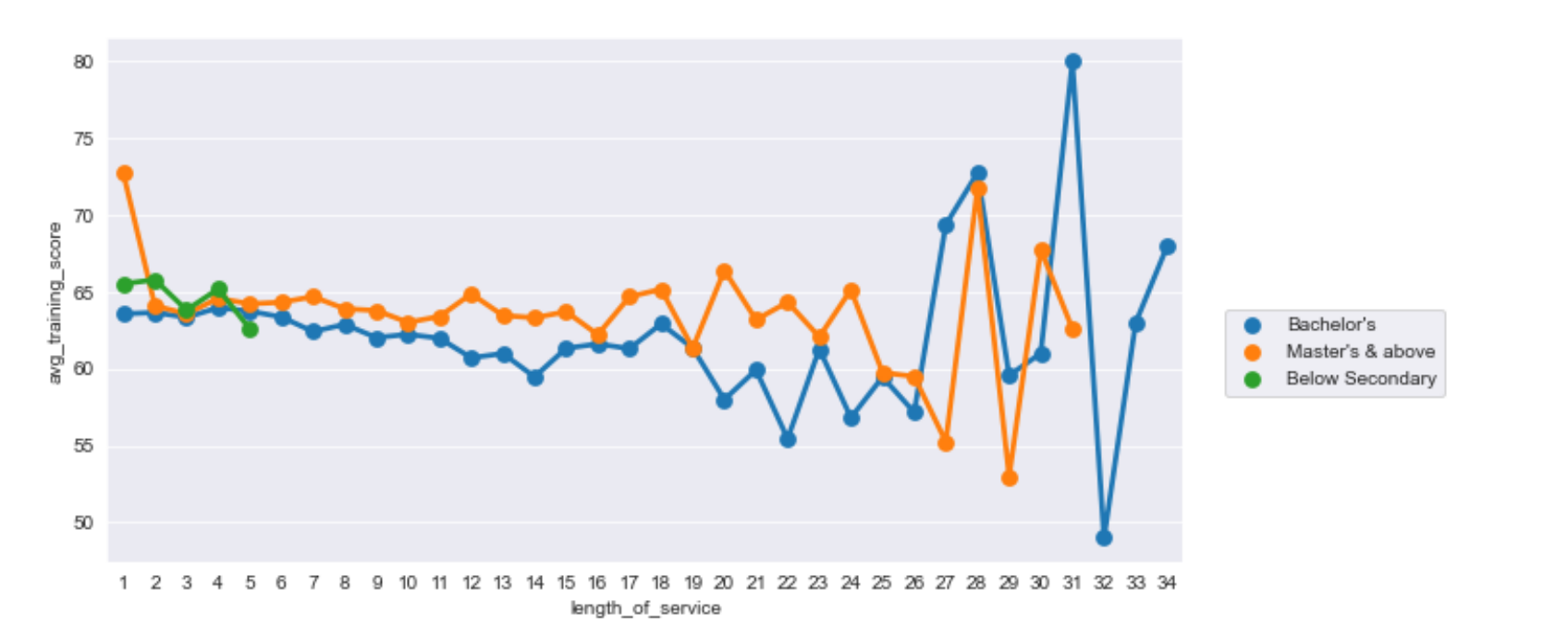 231 sns.pointplot(x="length_of_service",y="avg_training_score",hue='education', data=df,ci=None)