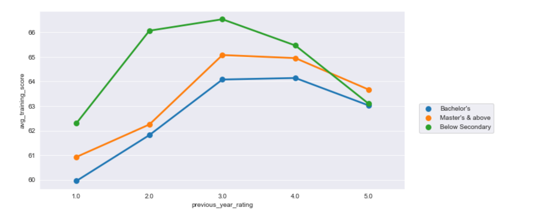 238 sns.pointplot(x="previous_year_rating",y="avg_training_score",hue='education', data=df,ci=None)