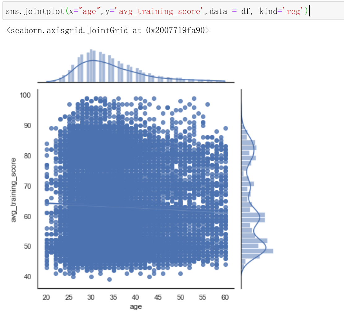 299 sns.jointplot(x="age",y='avg_training_score',data = df, kind='reg')