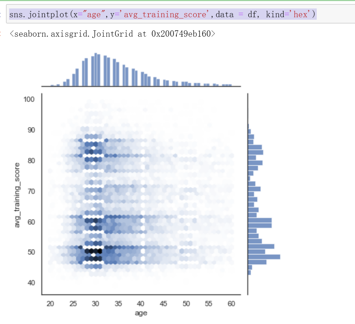 300 sns.jointplot(x="age",y='avg_training_score',data = df, kind='hex')