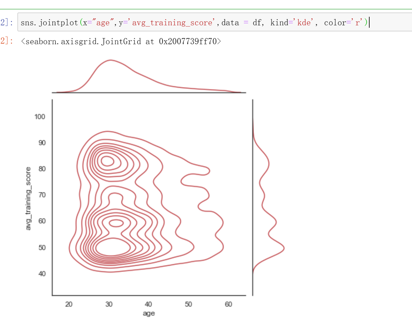 301 sns.jointplot(x="age",y='avg_training_score',data = df, kind='kde', color='r')