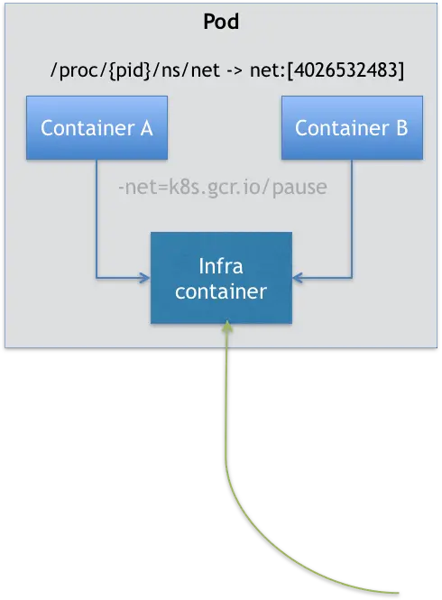 在这个 Pod 中,Infra 容器永远都是第一个被创建的容器,而其他用户定义的容器,则通过 Join Network Namespace 的方式,与 Infra 容器关联在一起。