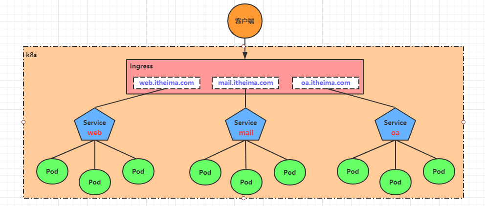 - 用户编写Ingress规则,说明哪个域名对应kubernetes集群中的哪个Service