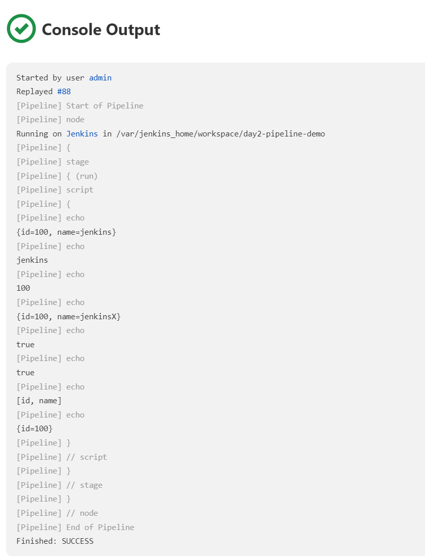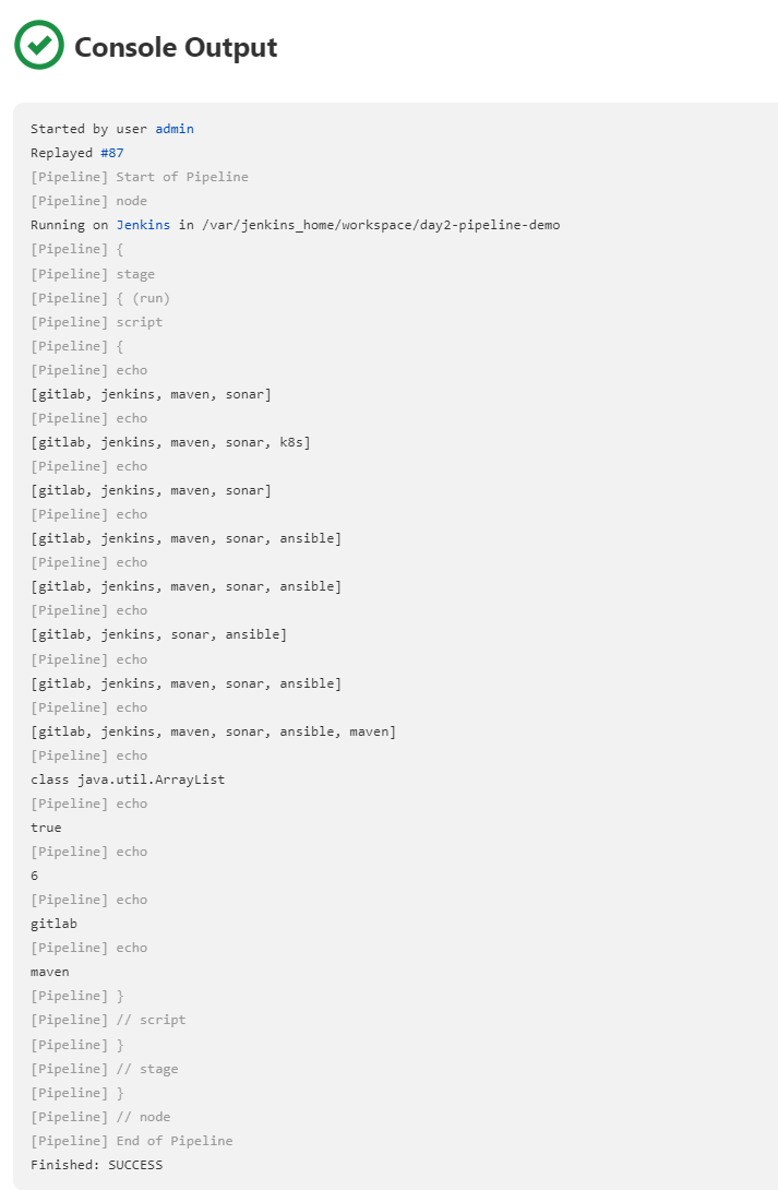 //List tools = ["gitlab", "jenkins", "maven", "sonar"] pipeline { agent any stages{ stage("run"){ steps{ script{ // script println(tools) // add println(tools + "k8s") println(tools) println(tools << "ansible") //改变原对象 println(tools) println(tools - "maven") println(tools) tools.add("maven") println(tools) println(tools.getClass()) // contains println(tools.contains("jenkins")) // length println(tools.size()) // index println(tools[0]) println(tools[-1]) } } } } }