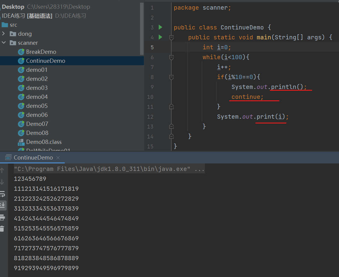 - continue语句用在循环语句体中,用于终止某次循环过程,即跳过循环体中尚未执行的语句,接着进行下一次是否执行循环的判定。