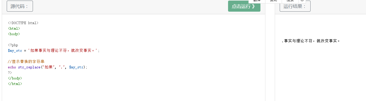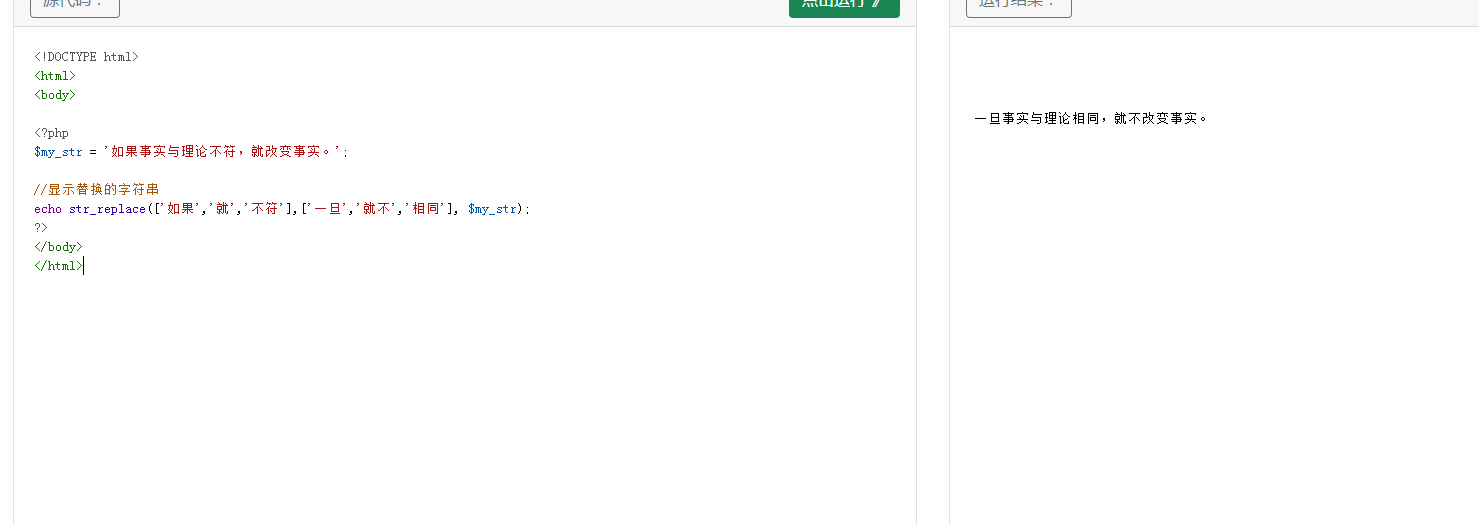 $my_str = '如果事实与理论不符,就改变事实。'; //显示替换的字符串echo str_replace("如果", ".", $my_str);