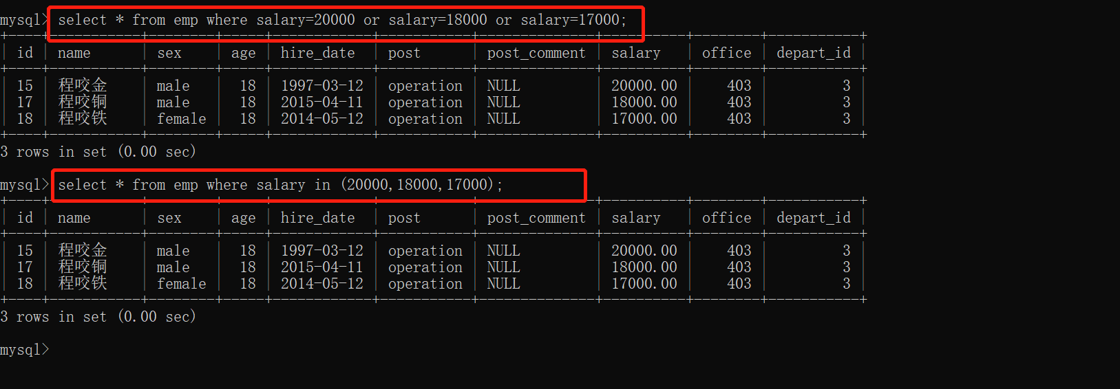 select * from emp where salary not in (20000,18000,17000);  # not 取反