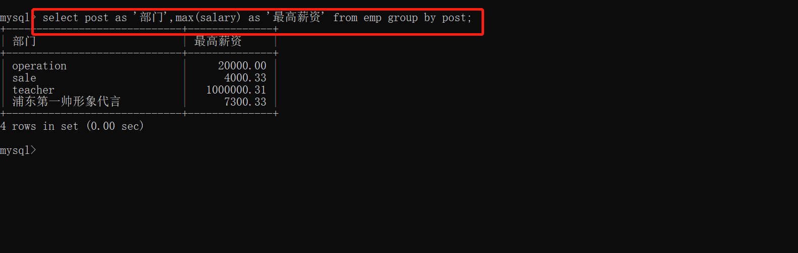 select name,salary from emp where name like '____';  # 由四个_组成代表四个字符