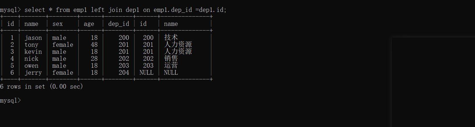 select * from emp,dep where emp.dep_id=dep.id;  # 这样的写法才对 指定表名 表名.字段名的方式
