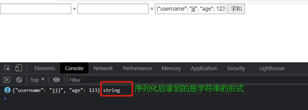 data:{'one':$('#d1').val(),'two':$('#d2').val()}, // 数据提交给后端(.val()方法获取用户输入在input框的数据)