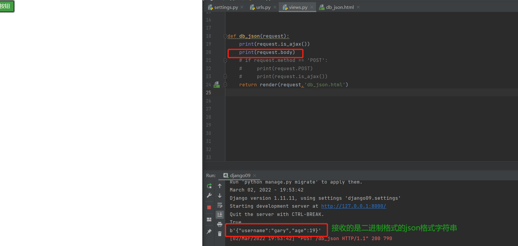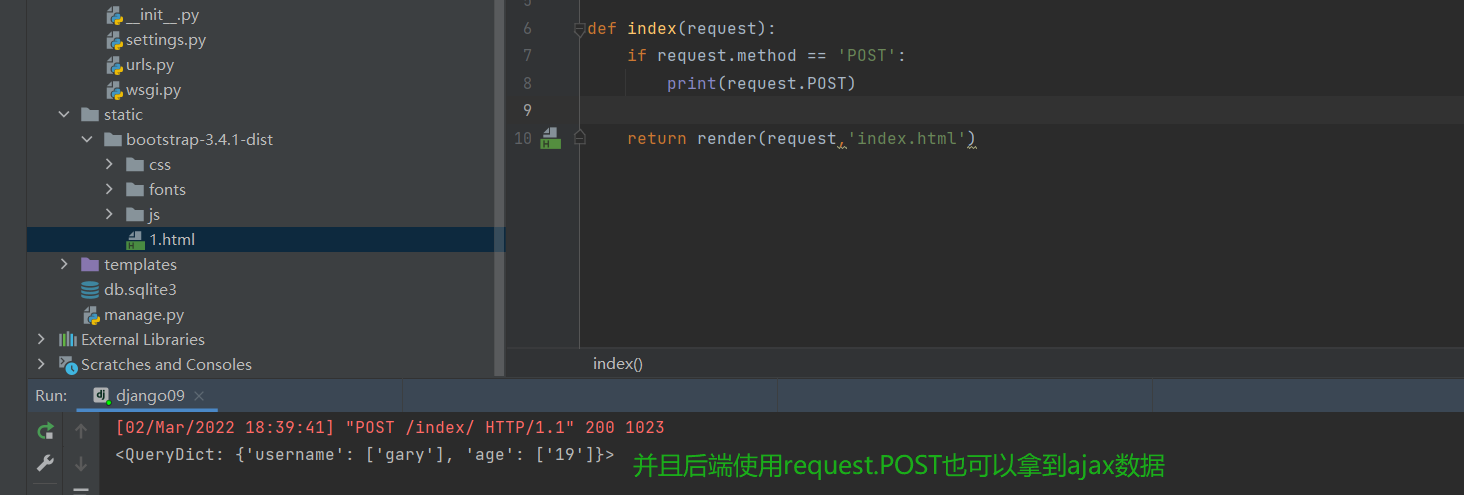 one = request.POST.get('one') # 拿到ajax发送的数据(如果是列表则需要用到getlist)