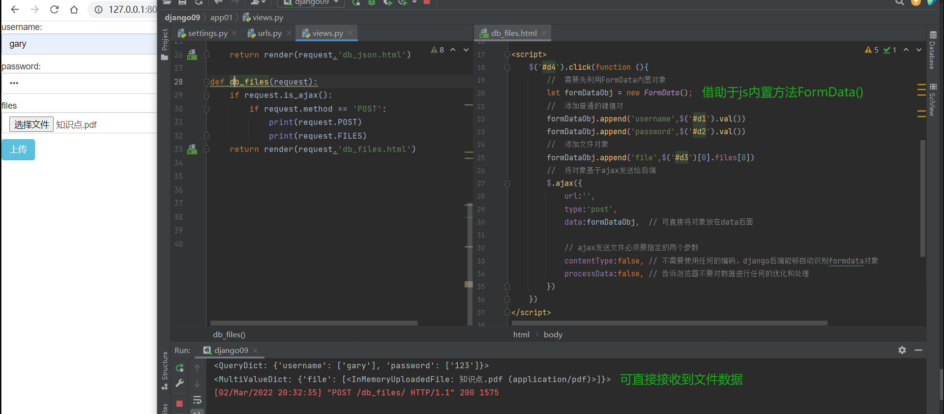 django后端能够直接识别到formdata对象并且能够将内部的普通键值自动解析并封装到request.POST中 文件数据自动解析并封装到request.FILES中