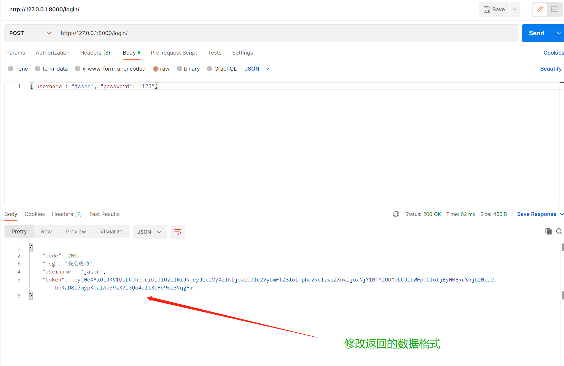 # 登录成功后,前端看到的格式是固定的,只有token,我们想做成如下格式
