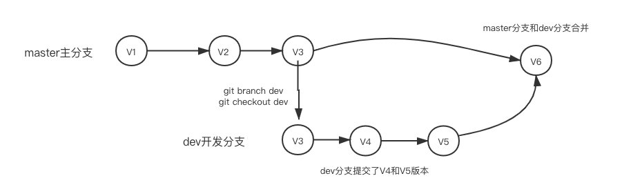 把dev分支合并到master分支:切换到master分支,执行合并dev分支的命令
