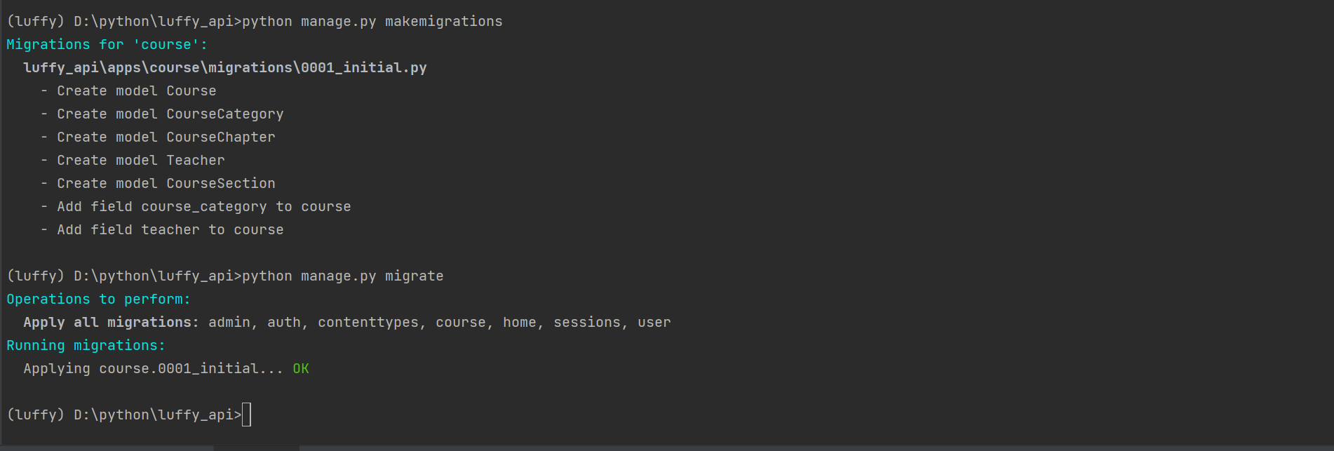 # 创建课程app,创建表,迁移表