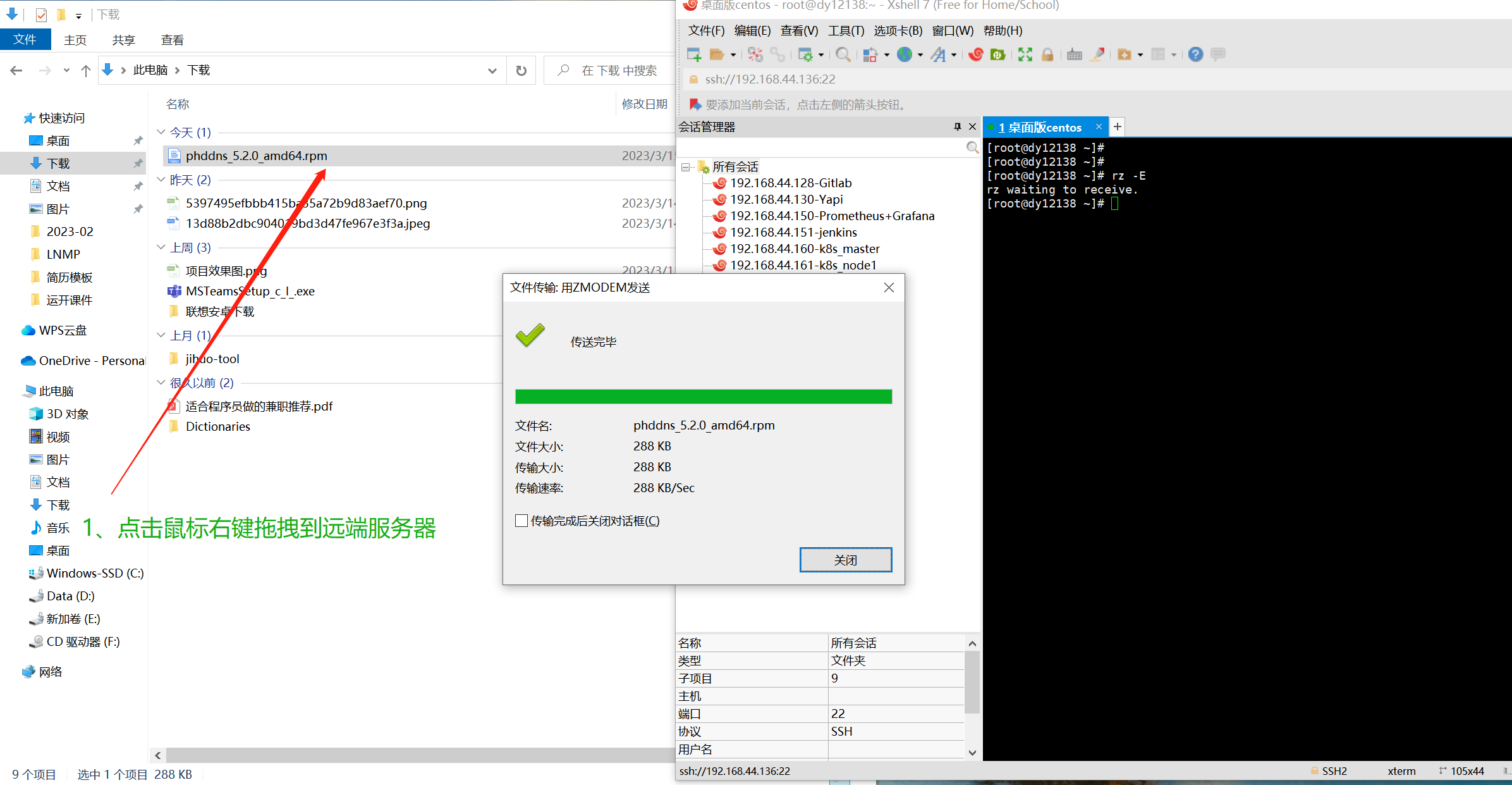 # 方式一:下载rpm安装包到本地电脑,使用xshell拖拽至服务器即可,如下图(推荐使用此方法):