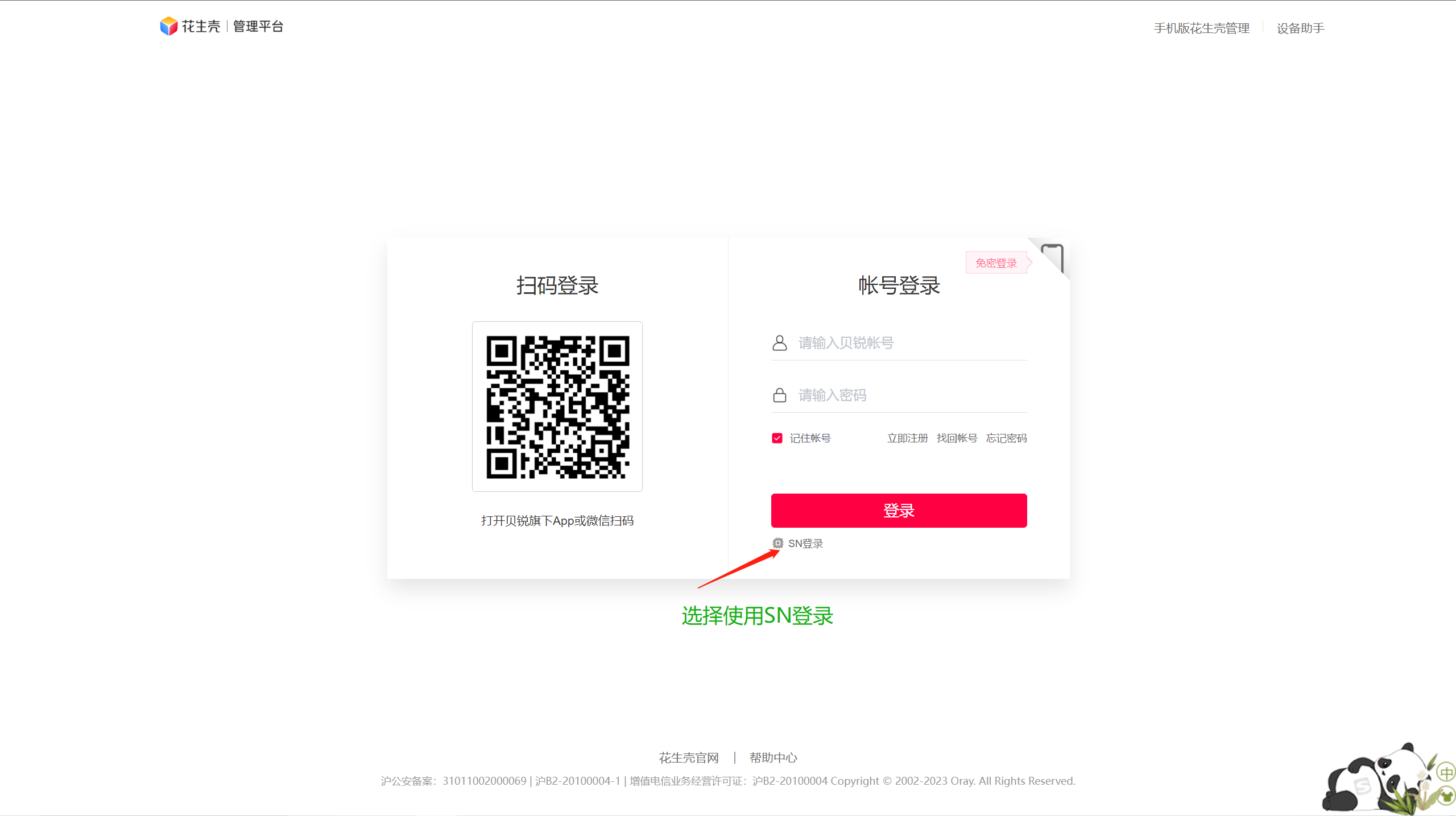 注意:激活成功后会赋予此帐号的密码给花生壳盒子,下次通过SN码登录b.oray.com站点时应当输入SN码与帐号的密码登录。可登录b站点,在“设备管理”中单独修改花生壳盒子的登录密码