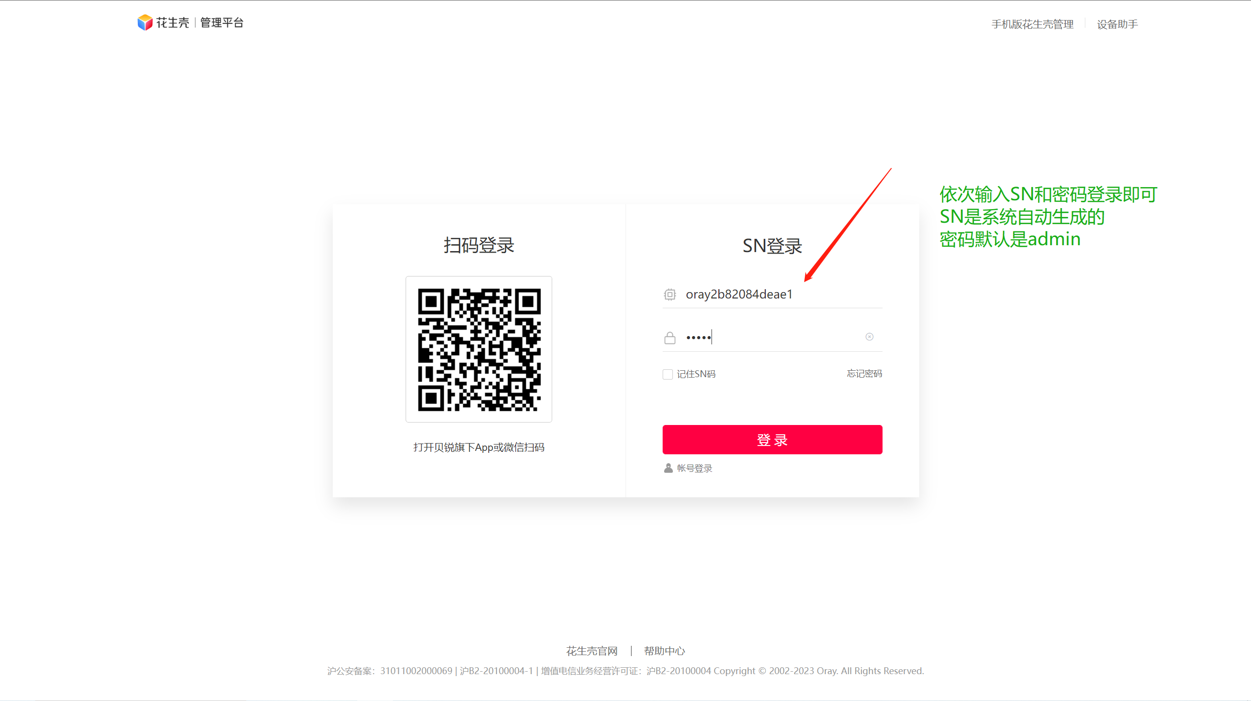 1、浏览器访问http://b.oray.com ,输入花生壳Linux 5.0在安装时产生SN码与默认登录密码admin登录