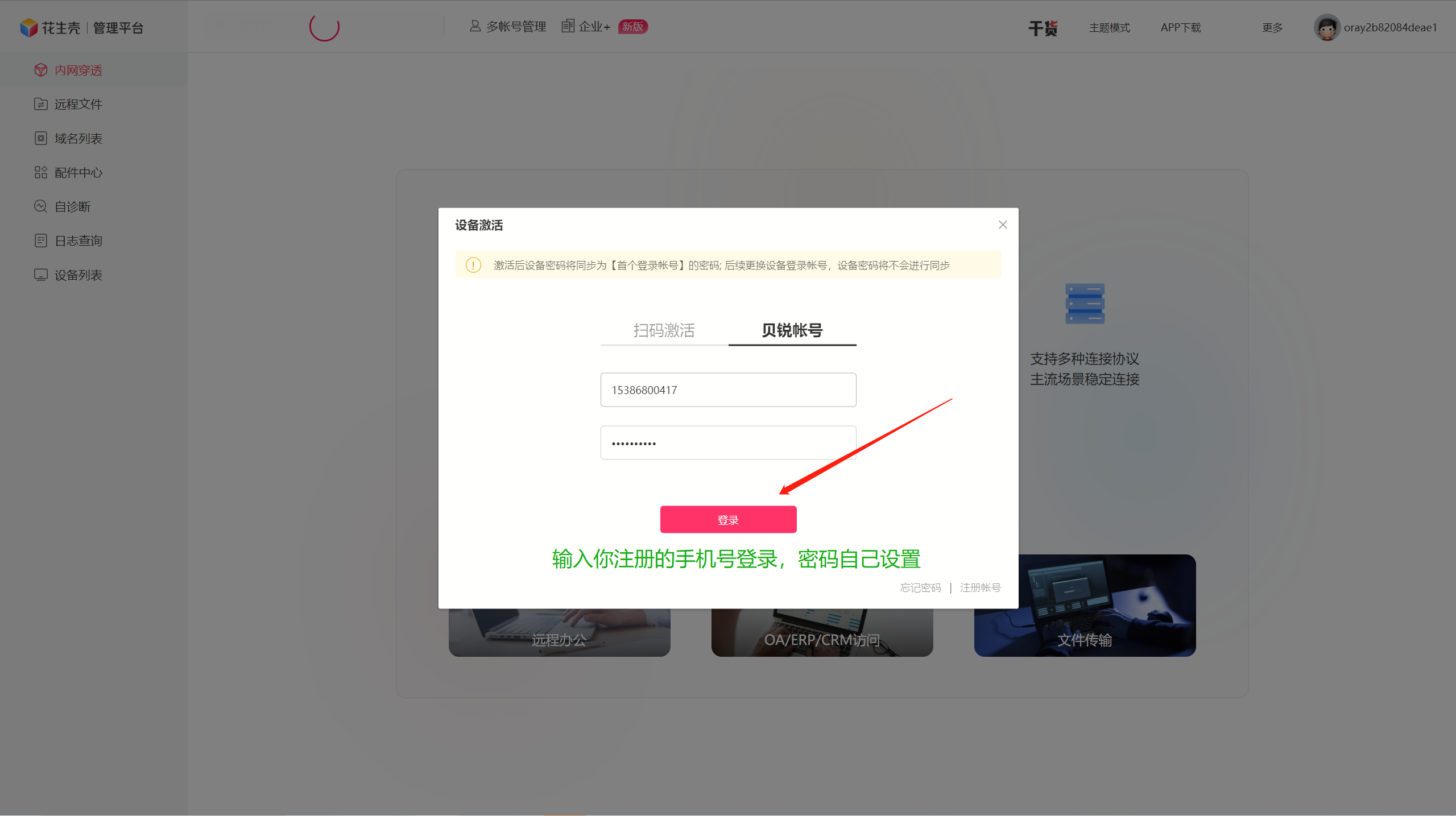 2.2 密码激活:输入已注册的贝锐帐号密码激活。