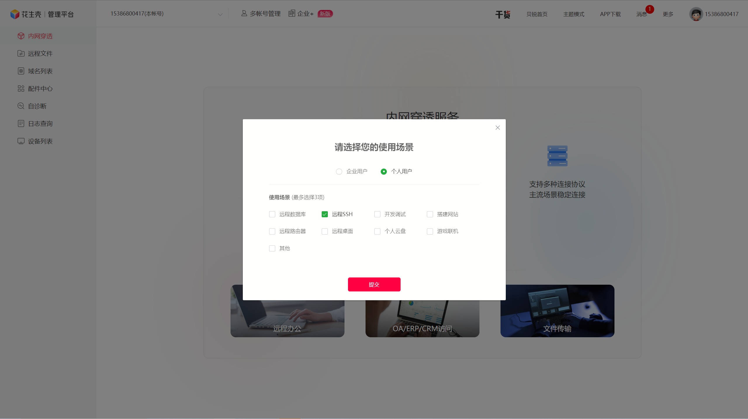 3、这里演示使用贝锐帐号密码激活,输入帐号密码后,点击提交即可。