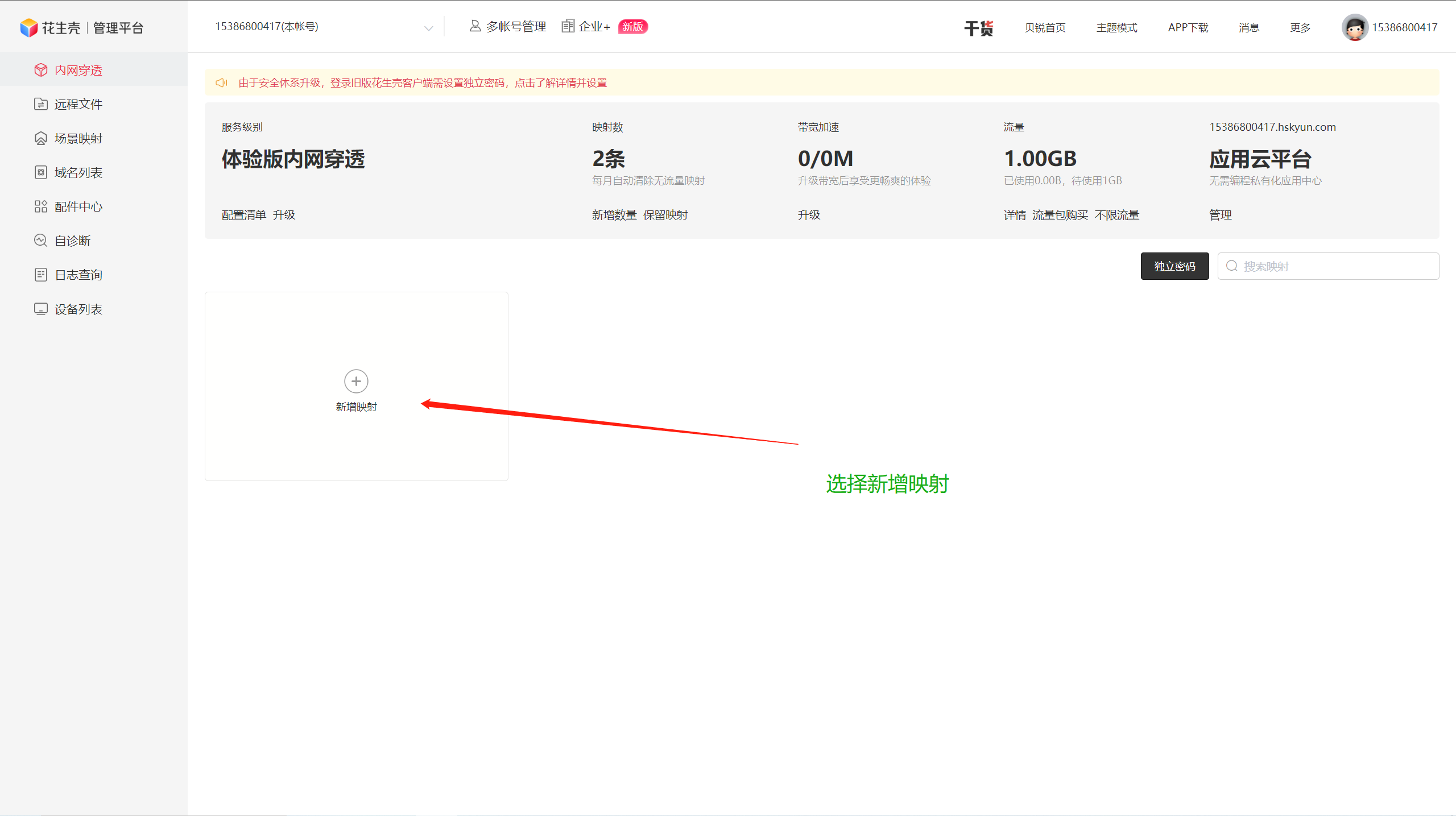 4、添加内网穿透映射时,点击页面上的“增加映射”按钮。