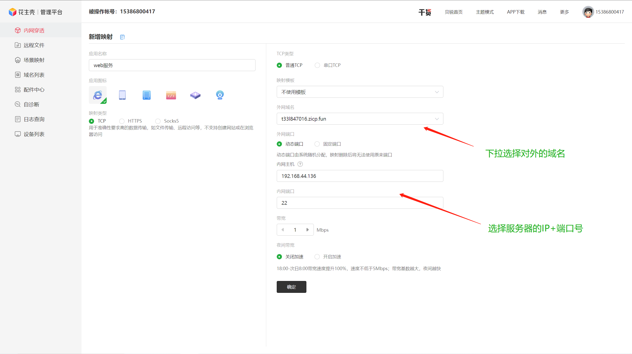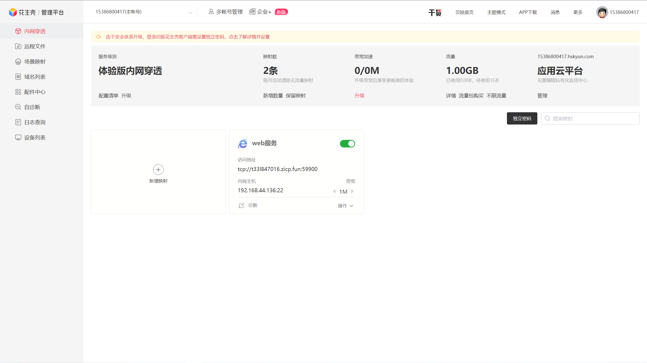 6、映射添加完成,生成格式为:域名+5位数端口号的外网访问地址。