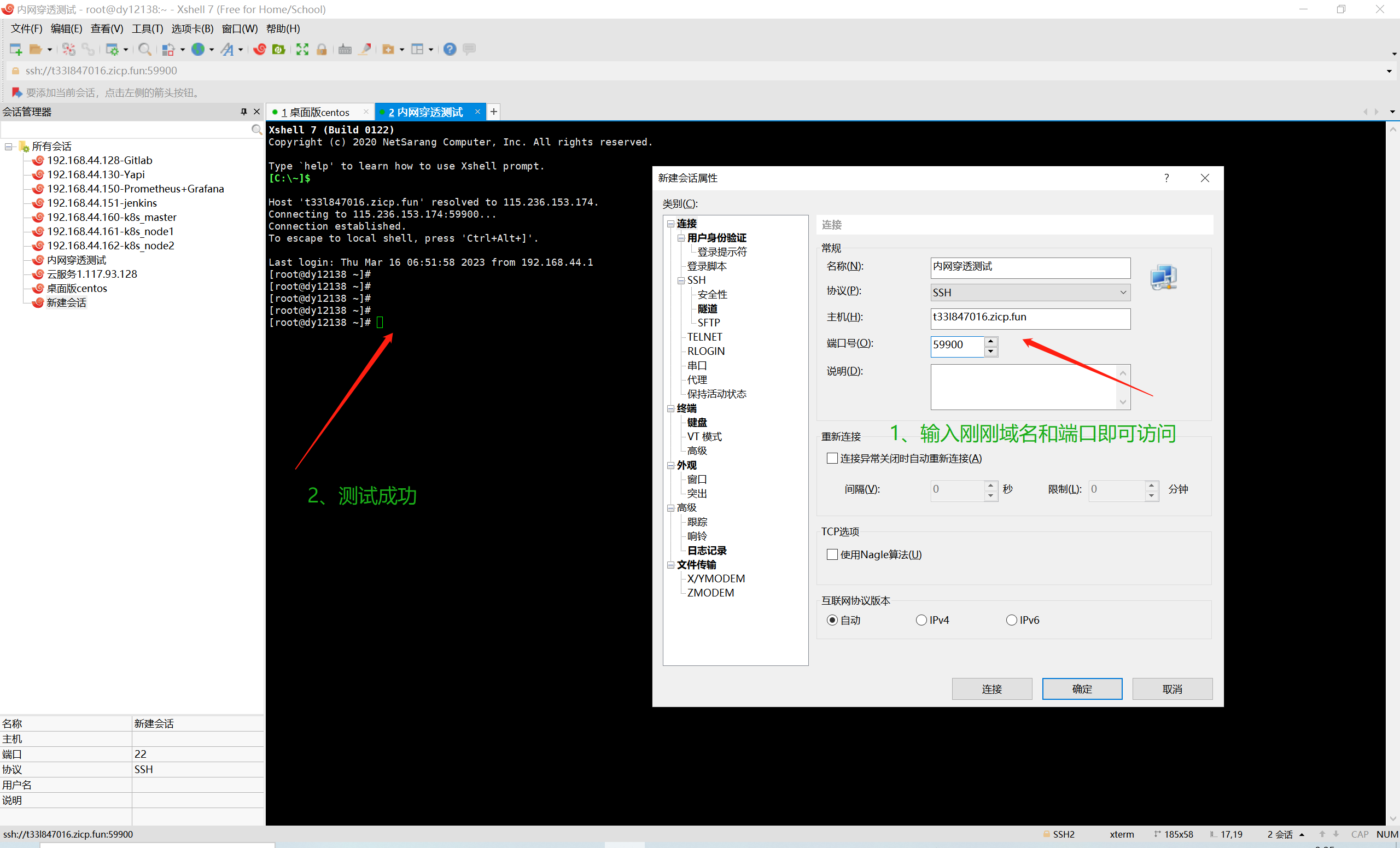 7、在外网的电脑上,打开连接SSH服务的工具程序,输入域名与5位数端口号