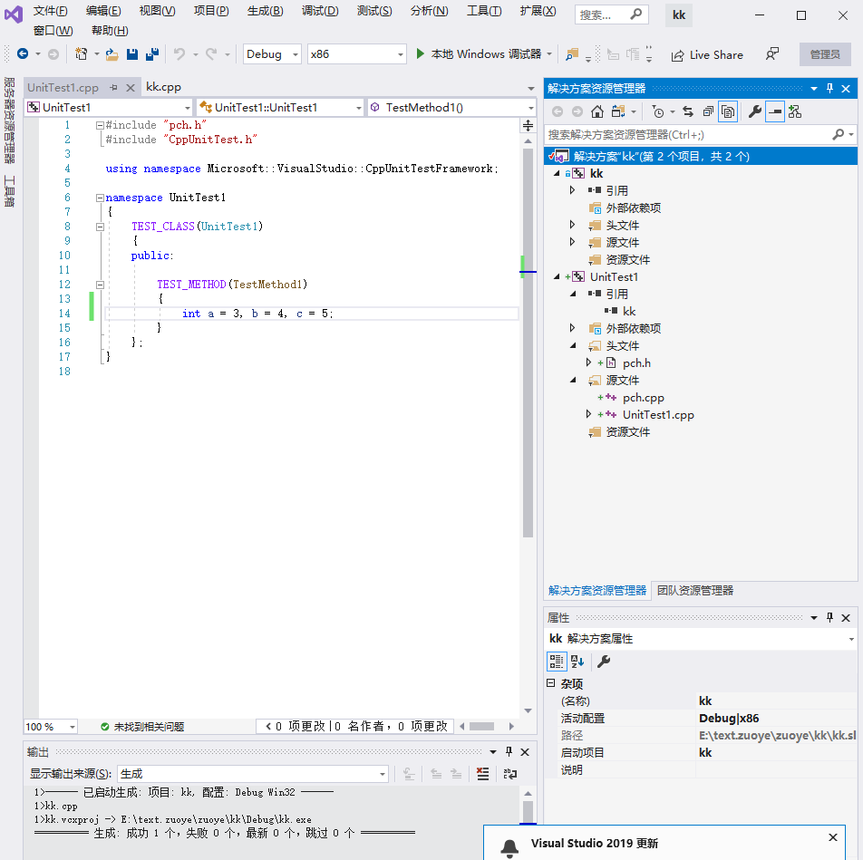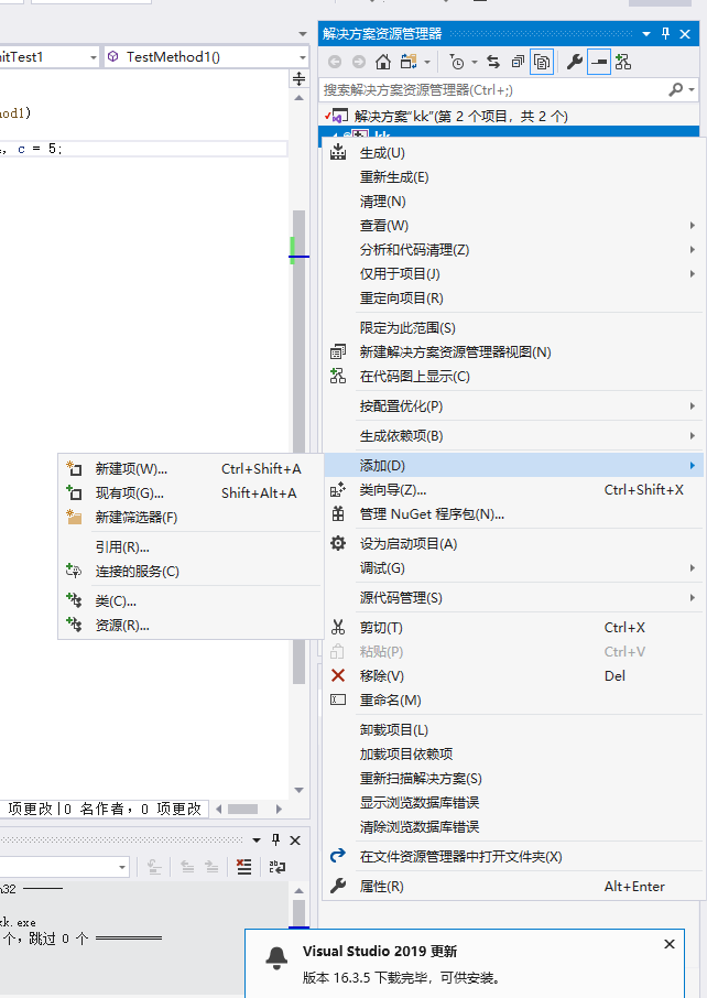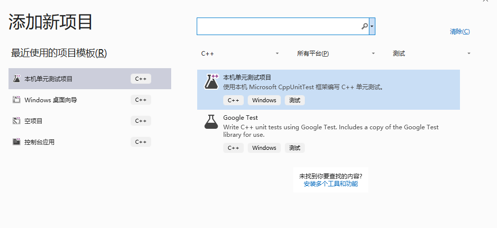 使用的单元测试框架是Microsoft CppUnitTest,右键点击“解决方案”->"添加"->“新建项目”