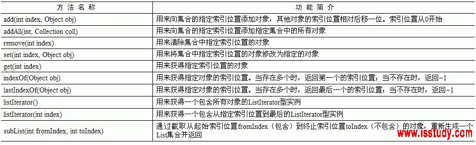 List包括List接口以及List接口的所有实现类。因为List接口实现了Collection接口,所以List接口拥有Collection接口提供的所有常用方法,又因为List是列表类型,所以List接口还提供了一些适合于自身的常用方法,如表1所示。