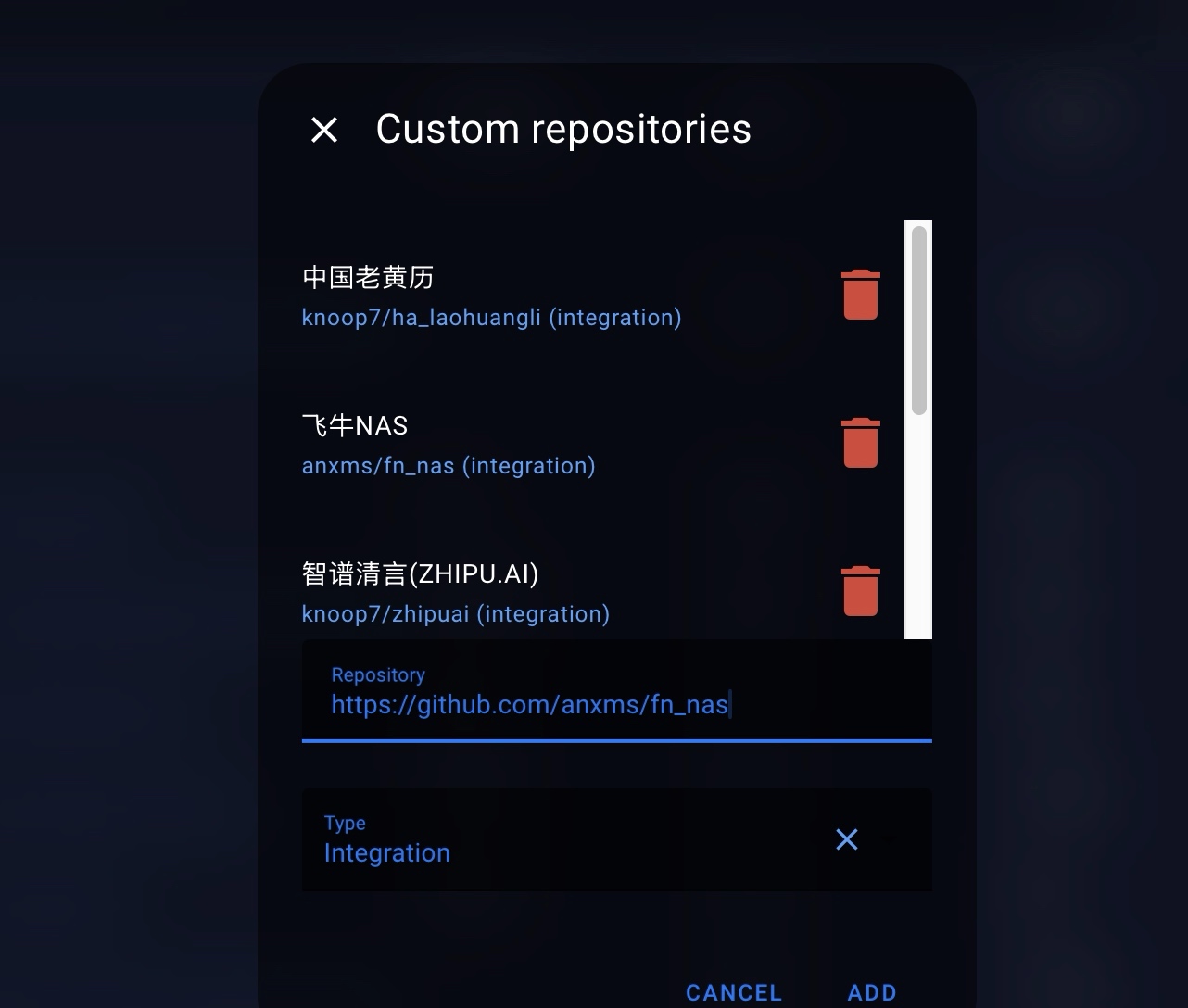 进入 Home Assistant 的 HACS 商店,添加自定义存储库: