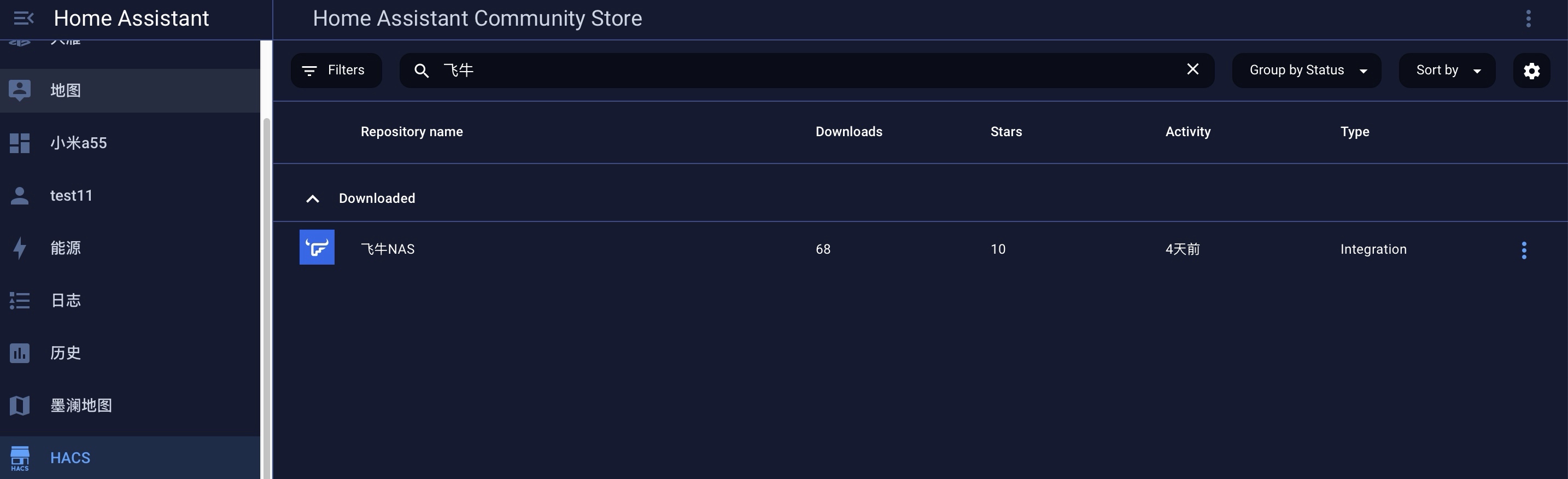 在 HACS 中搜索 "飞牛 NAS",找到对应集成并点击下载,下载成功后重启HomeAssistant。