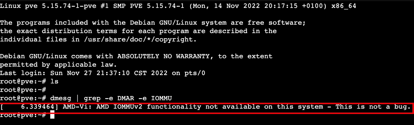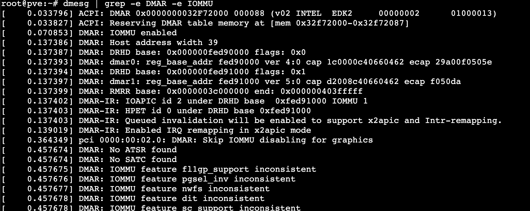 开启 IOMMU 后,BIOS 可以收集 IOMMU 硬件相关的信息以及它和 PCIe 设备连接关系的信息,使用如下命令检测是否开启,如果开启 IOMMU 的话可以看到一些 PCIe 硬件设备: