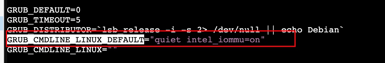 GRUB_CMDLINE_LINUX_DEFAULT="quiet intel_iommu=on iommu=pt "