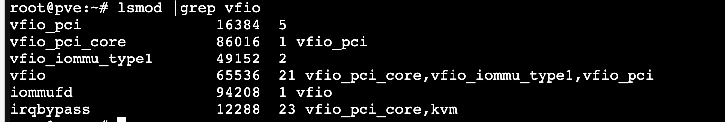 重启后,检查之前配置的 VFIO 模块是否正常加载: