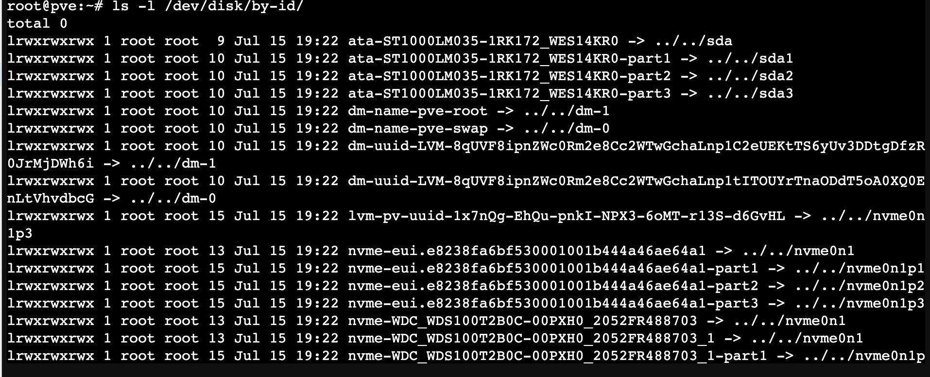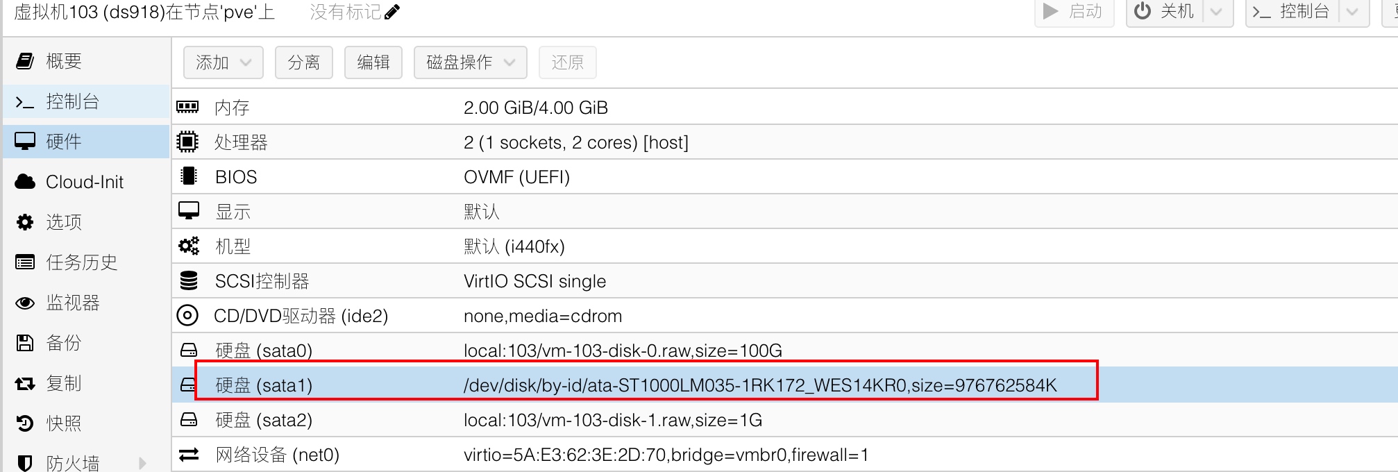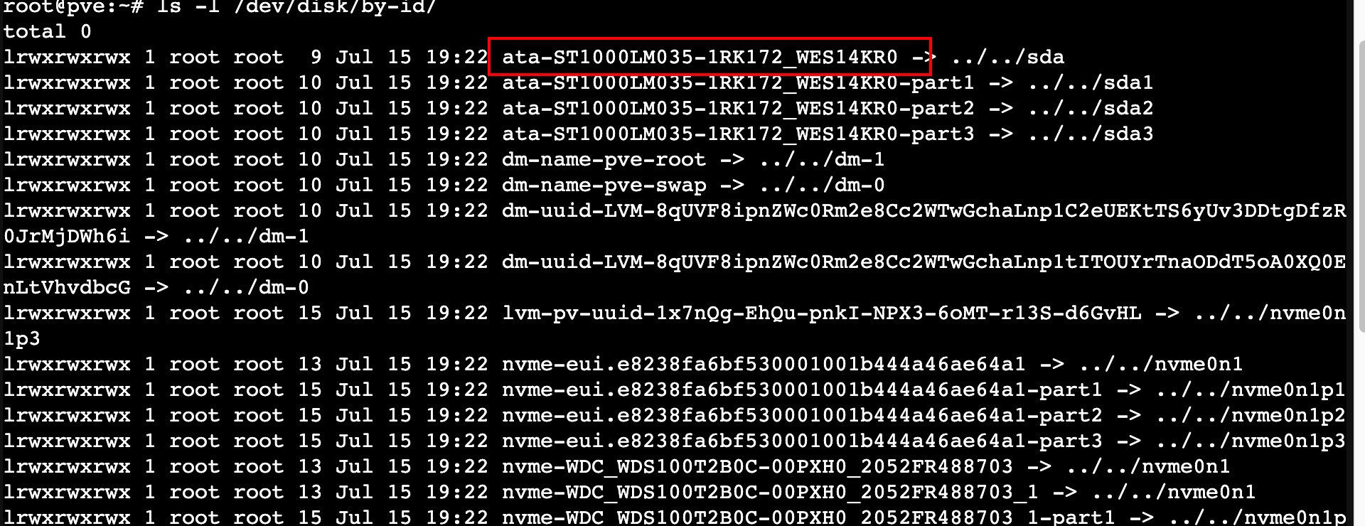qm set 103 -sata1 /dev/disk/by-id/ata-ST1000LM035-1RK172_WES14KR0