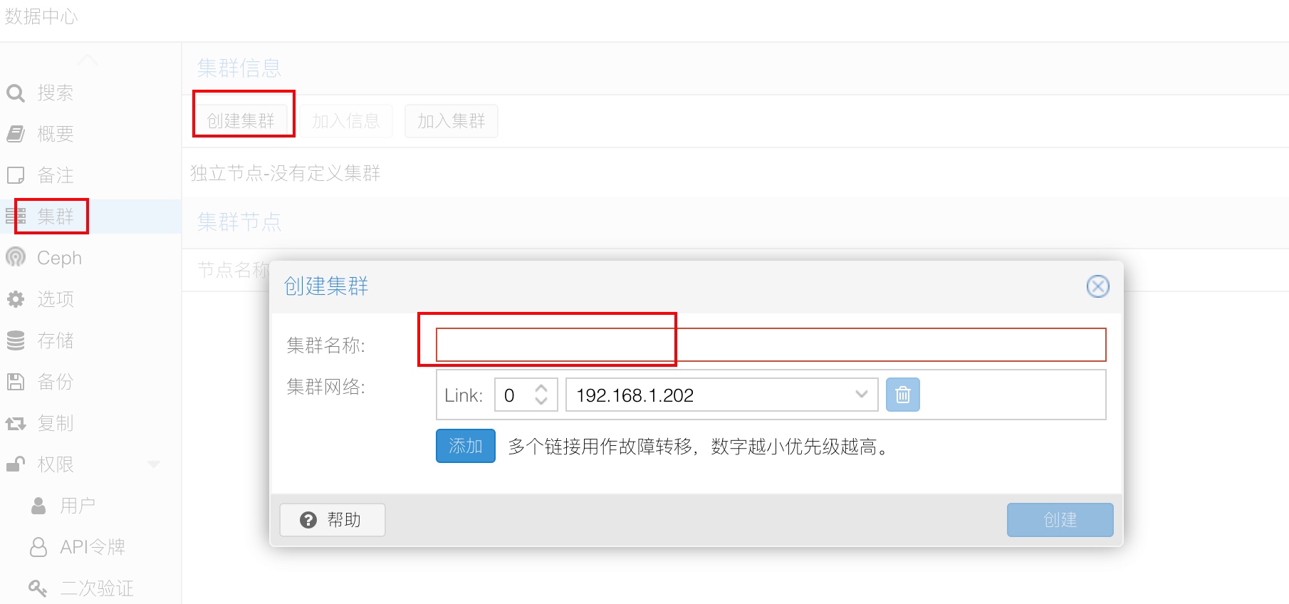 点击左侧节点名称(如 pve-node1)→ 选择 “数据中心”→ 点击 “集群”→ 点击 “创建集群”。