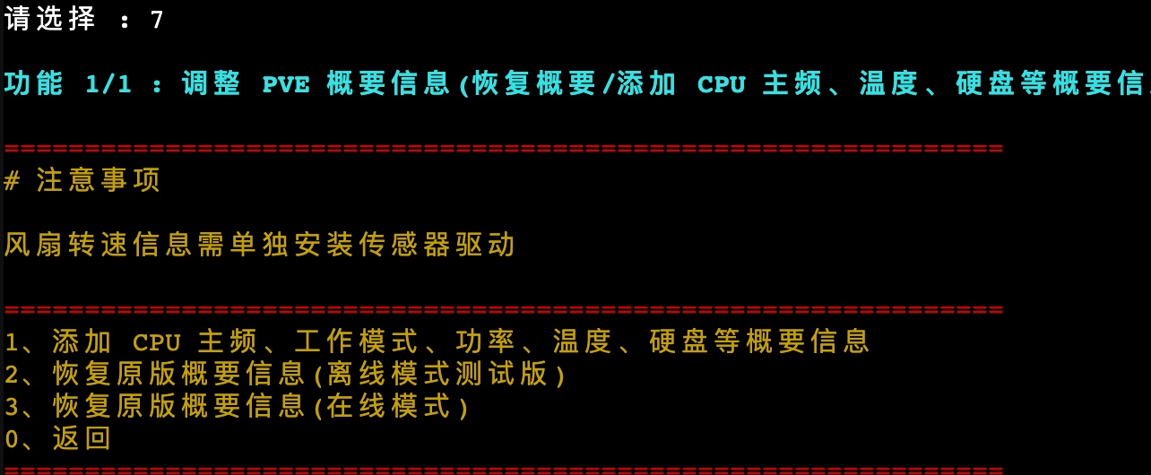 5、修改 PVE 概要信息栏,增加 CPU及线程频率、CPU及核心、主板等工作状态及温度,风扇转速,NVME及机械硬盘的型号、容量、温度、通电时间、IO状态等信息显示。其中NVME支持0E故障监测。UPS 信息
