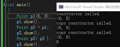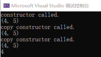 1 #include <iostream> 2 using std::cout; 3 using std::endl; 4 5 class Point 6 { 7 public: 8 Point(int x0 = 0, int y0 = 0); 9 Point(const Point&p ); 10 ~Point() = default; 11 int get_x() const { return x; } 12 int get_y() const { return y; } 13 void show() const; 14 private: 15 int x, y; 16 }; 17 18 Point::Point(int x0, int y0): x{x0}, y{y0} 19 { 20 cout << "constructor called." << endl; 21 } 22 23 Point::Point(const Point& p): x{p.x}, y{p.y} 24 { 25 cout << "copy constructor called." << endl; 26 } 27 void Point::show() const 28 { 29 cout << "(" << x << ", " 30 << y << ")" << endl; 31 } 32 int main() 33 { 34 Point p1(4, 5); 35 p1.show(); 36 Point p2 = p1; 37 p2.show(); 38 Point p3{p2}; 39 p3.show(); 40 cout << p3.get_x() << endl; 41 }