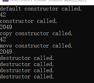 1 #include <iostream> 2 class X 3 { 4 public: 5 X(); 6 ~X(); 7 X(int m); 8 X(const X& obj); 9 X(X&& obj) noexcept; 10 void show() const; 11 private: 12 int data; 13 }; 14 X::X() : data{ 42 } 15 { 16 std::cout << "default constructor called.\n"; 17 } 18 X::~X() 19 { 20 std::cout << "destructor called.\n"; 21 } 22 X::X(int m) : data{ m } 23 { 24 std::cout << "constructor called.\n"; 25 } 26 X::X(const X& obj) : data{ obj.data } 27 { 28 std::cout << "copy constructor called.\n"; 29 } 30 X::X(X&& obj) noexcept : data{ obj.data } 31 { 32 std::cout << "move constructor called.\n"; 33 } 34 void X::show() const 35 { 36 std::cout << data << std::endl; 37 } 38 int main() { 39 X x1; 40 x1.show(); 41 X x2{ 2049 }; 42 x2.show(); 43 X x3{ x1 }; 44 x3.show(); 45 X x4{ std::move(x2) }; 46 x4.show(); 47 }