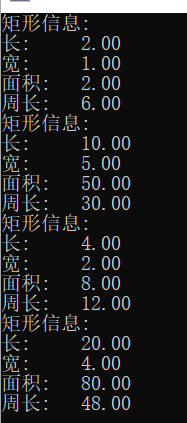 1 #include <iostream> 2 #include <iomanip> 3 4 class Rectangle 5 { 6 public: 7 Rectangle(); 8 Rectangle(double l , double w ); 9 Rectangle(const Rectangle& rect); 10 ~Rectangle()=default; 11 double len()const{return length;} 12 double wide()const { return width; } 13 double area()const { return length * width; } 14 double circumference()const { return 2 * length + 2 * width; } 15 void resize(int times); 16 void resize(int l_times, int w_times); 17 private: 18 double length, width; 19 }; 20 Rectangle::Rectangle() 21 { 22 length = 2.0; 23 width = 1.0; 24 } 25 Rectangle::Rectangle(double l, double w) 26 { 27 length = l; 28 width = w; 29 } 30 Rectangle::Rectangle(const Rectangle& rect) 31 { 32 length = rect.length; 33 width = rect.width; 34 } 35 void Rectangle::resize(int times) 36 { 37 length *= times; 38 width *= times; 39 } 40 void Rectangle::resize(int l_times, int w_times) 41 { 42 length *= l_times; 43 width *= w_times; 44 } 45 46 47 void output(const Rectangle& rect) 48 { 49 using namespace std; 50 cout << "矩形信息: \n"; 51 cout << "长: " << fixed << setprecision(2) << rect.len() << endl; 52 cout << "宽: " << fixed << setprecision(2) << rect.wide() << endl; 53 cout << "面积: " << fixed << setprecision(2) << rect.area() << endl; 54 cout << "周长: " << fixed << setprecision(2) << rect.circumference() << endl; 55 } 56 int main() 57 { 58 Rectangle rect1; 59 output(rect1); 60 Rectangle rect2(10, 5); 61 output(rect2); 62 Rectangle rect3(rect1); 63 rect3.resize(2); 64 output(rect3); 65 rect3.resize(5, 2); 66 output(rect3); 67 }